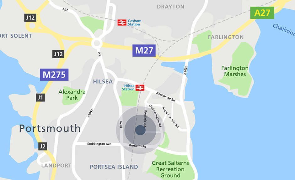 Pioneer Park is located on Portfield Road and forms part of the established Airport Industrial Estate, Portsmouthʼs premier industrial, warehousing and distribution location. The park benefits from good access to the A27, which in turn provides direct access to Southampton and to the West via the M27 and London and Guildford via the A3(M). Journey times have been improved by the opening of the Hindhead Tunnel.